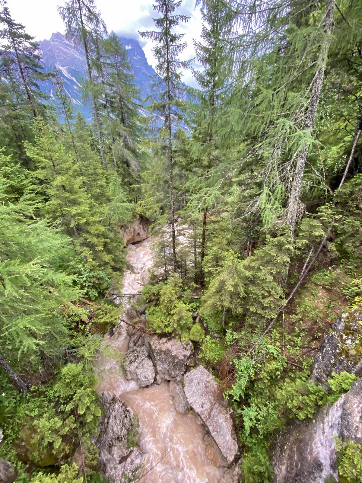Our final day on the Alta Via, it’s all downhill from here, literally! Today we descended 3200 ft down the mountain back to civilization in Cortina mostly in the rain. The trail ran along Croda da Lago and then led thru quiet spruce forests. After a slight unintentional detour, we climbed up a steep ridge to discover remnants of an old stone building perched on top of this limestone pinnacle at 6100 ft elevation with steep cliffs on all sides…Becco d’Ajal. The vistas were spectacular although shrouded a bit by the cloud cover, but provided amazing view of Cortina tucked below the majestic Cristallo mountain range. Rainstorms were building so continued our journey quickly down the mountain passing beautiful mountain streams along the way. Enjoyed a rest stop at the tranquil Lago d’Ajal before sliding our way down the soggy and muddy trails to the bottom. The wooded trail ended near a small village and continued along minor roads and pathways until reaching Cortina. Finished off the day and weeklong hike with a visit to the local spa.